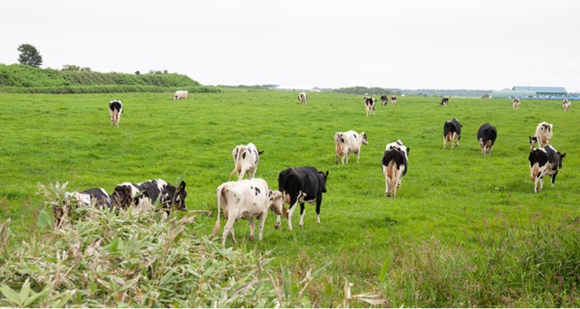 オホーツクの海のミネラルをたっぷりと含んだ牧草を食べ、雄大な山々から注ぐ清らかな水を飲み、のびのび育った乳牛。